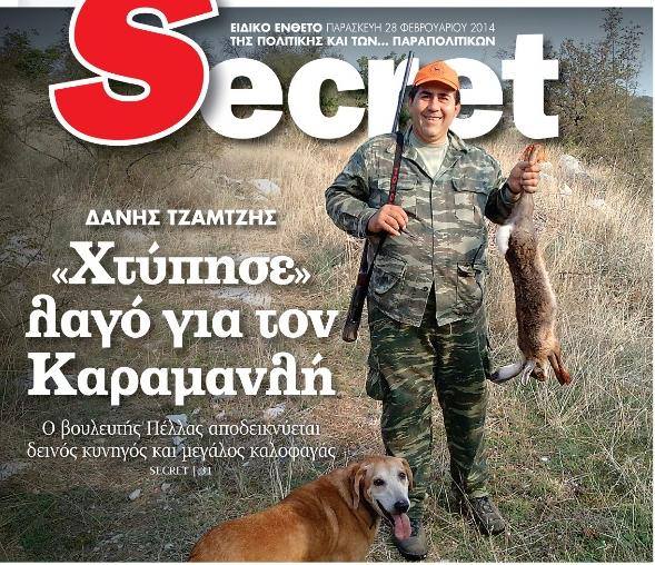 Φορώντας τη στολή κυνηγού, με το όπλο στον ωμο και ένα νεκρό λαγό στο χέρι, ο Δανής Τζαμτζής (ΝΔ) φωτογραφίζεται με καμάρι.