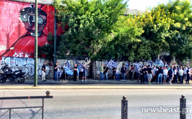 έχουν συγκεντρωθεί μερικά μέλη της Χρυσής Αυγής, δίνοντας ενα ακόμη σόου, κρατώντας σημαίες και φωνάζοντας συνθήματα.
