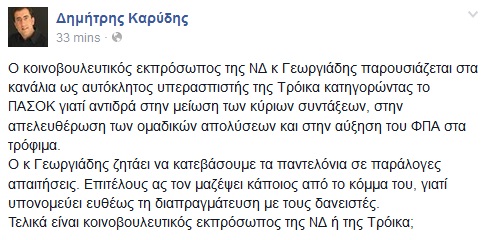 κοινοβουλευτικός εκπρόσωπος της ΝΔ ή της Τρόικα;» διερωτάται, μεταξυ άλλων, το στέλεχος του ΠΑΣΟΚ. Διαβαστε το κείμενο που ανέβασε στο Facebook: