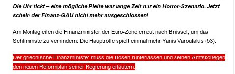 «Την Δευτέρα, οι υπουργοί Οικονομικών της ευρωζώνης θα συγκεντρωθούν και πάλι στις Βρυξέλλες για να αποφύγουν τα χειρότερα. Πρωταγωνιστής σε αυτό το δράμα θα είναι και πάλι ο Γιάνης Βαρουφάκης. Ο 'Ελληνας υπουργός Οικονομικών πρέπει να ξεβρακωθεί και να εξηγήσει στους ομολόγους του το νέο μεταρρυθμιστικό σχέδιο της κυβέρνησής του. Μόνο αν οι υπουργοί Οικονομικών μείνουν ικανοποιημένοι και σηκώσουν επιδοκιμαστικά τον αντίχειρά τους, τότε θα δοθεί χρηματική βοήθεια στον εταίρο τους».