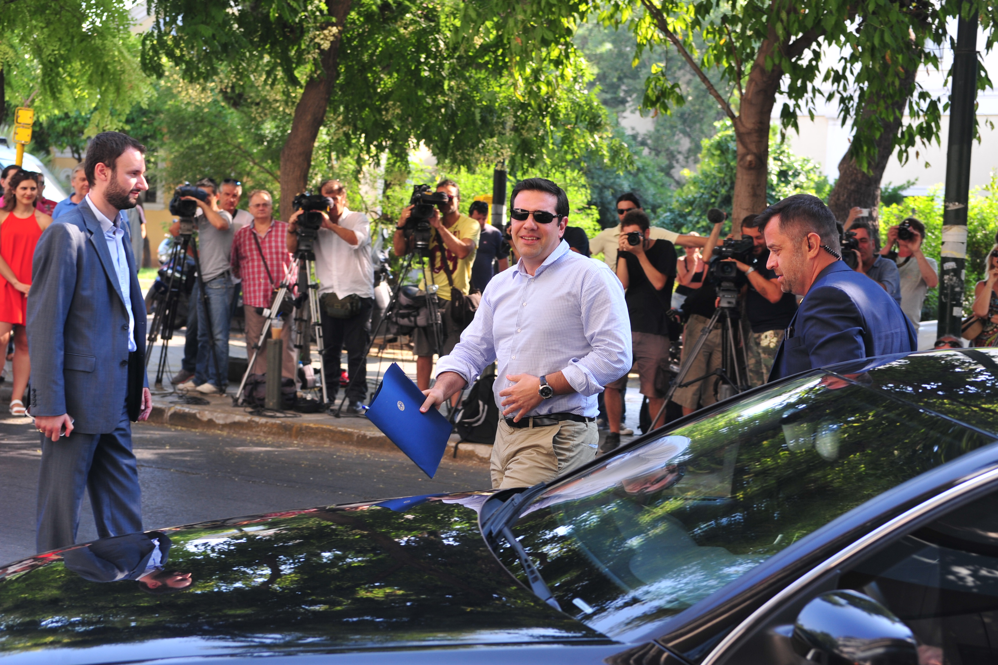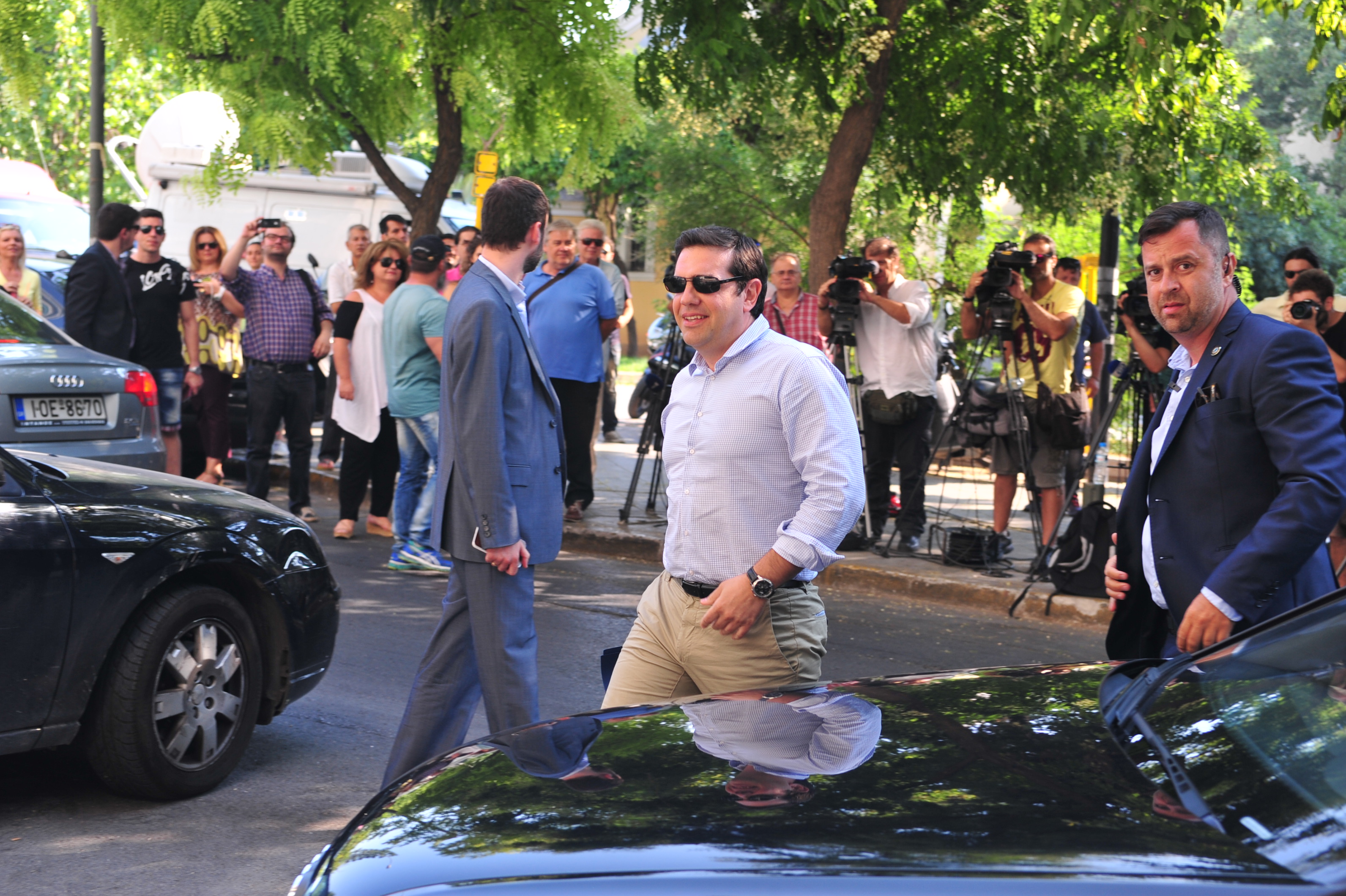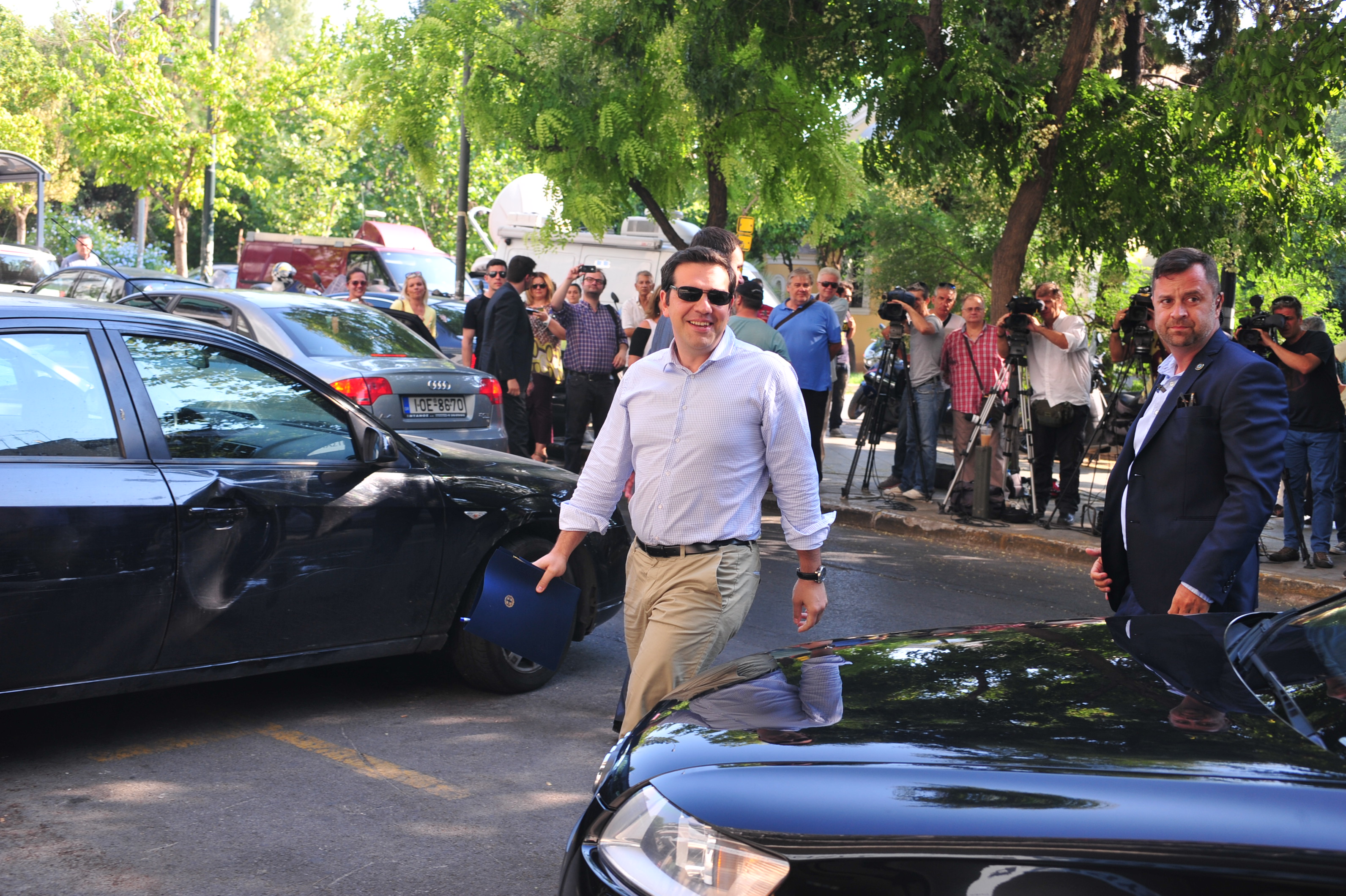 Χωρίς κοστούμι και φορώντας μαύρα γυαλιά ηλίου έφτασε χαμογελαστός ο Αλέξης Τσίπρας στην Κουμουνδούρου, όπου...