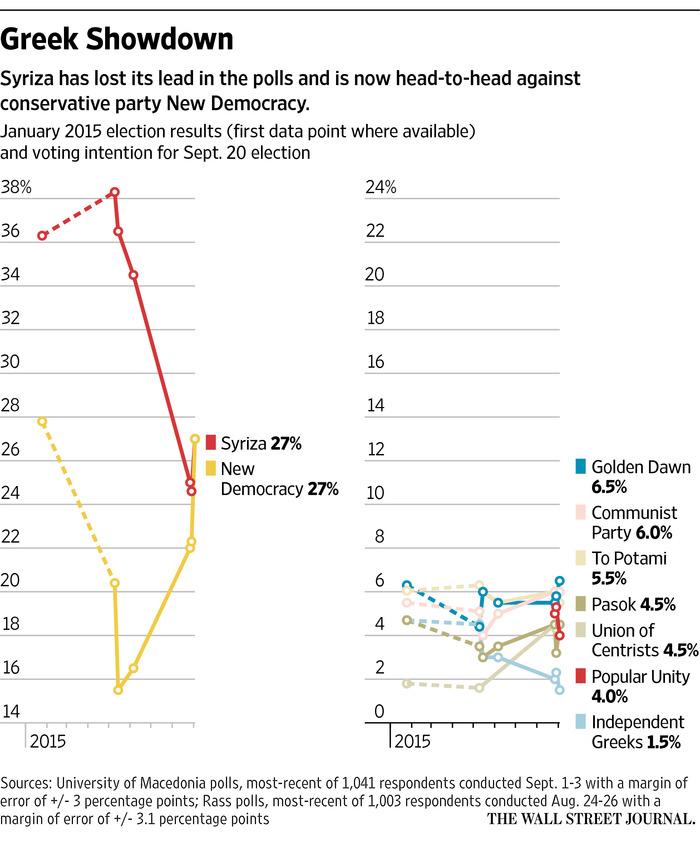 Το άρθρο σημειώνει πως όταν ο Τσίπρας προκήρυξε πρόωρες εκλογές, υπήρχε διάχυτη η αίσθηση ότι θα επικρατήσει και μάλιστα με ευκολία. Ωστόσο, ο Βαγγέλης Μεϊμαράκης κατάφερε να μειώσει τη διαφορά που είχαν τα δύο κόμματα και τώρα έχει βάσιμες ελπίδες να τον νικήσει και να γίνει πρωθυπουργός. Από την άλλη, η δημοτικότητα του ΣΥΡΙΖΑ έχει καταρρεύσει αμέσως μετά την αποχώρηση της ομάδας Λαφαζάνη.