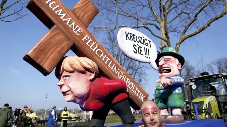 Σε ένα από τα άρματα, η γερμανίδα καγκελάριος εμφανίζεται σαν άλλος Χριστός να κουβαλά έναν σταυρό με τη σχετική επιγραφή πάνω στο άρμα να αναφέρει: «Σταυρώστε την. Ανθρώπινη πολιτική για τους πρόσφυγες». Ενώ σε ένα άλλο άρμα, η κ. Μέρκελ εμφανίζεται μέσα σε μία βάρκα με γερμανική σημαία να παλεύει με τα κύματα, που αναπαριστούν το «κύμα» των προσφύγων προς την Ευρώπη.