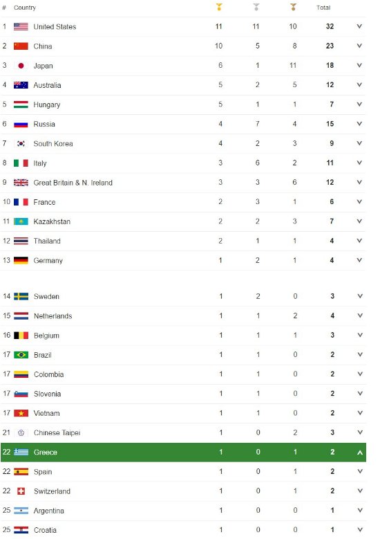 Στην πρώτη πεντάδα βρίσκονται Ιαπωνία, Αυστραλία και Ουγγαρία ενώ η Ελλάδα με τα δύο μετάλλια της Άννας Κορακάκη βρίσκεται στην 22η θέση...