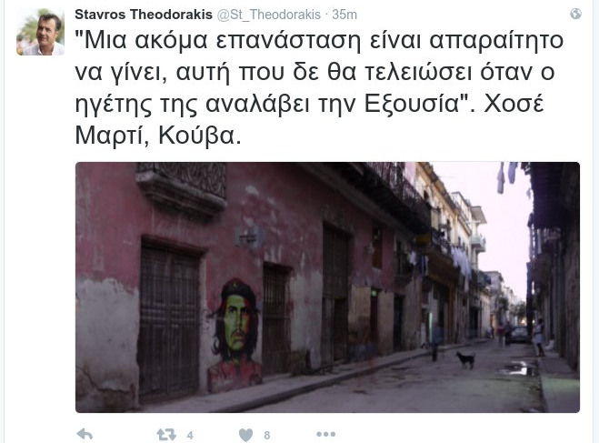 Με ανάρτηση του στο twitter και τους στοίχους του ποιητή Χοσέ Μαρτί σχολιάζει την είδηση του θανάτου του Φιντέλ Κάστρο ο Σταύρος Θεοδωράκης.