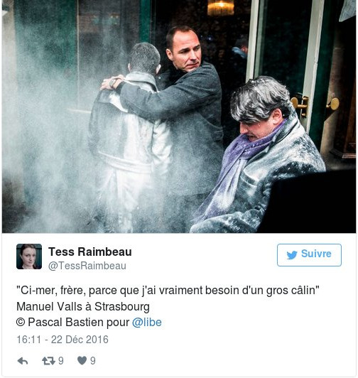 «Είσαι λίγο άσπρος!» τον ειρωνεύτηκε ο δήμαρχος Στρασβούργου Roland Ries. «Αχ, τα προβλήματα!» του είπε ένας άλλος. Ο Μανουέλ Βαλς συνέχισε το πρόγραμμά του σαν να μην είχε συμβεί τίποτα. Η σύζυγός του Anne Gravoin του καθάρισε με μια χαρτοπετσέτα το λαιμό για να σβήσει και τα τελευταία ίχνη από αλεύρι...