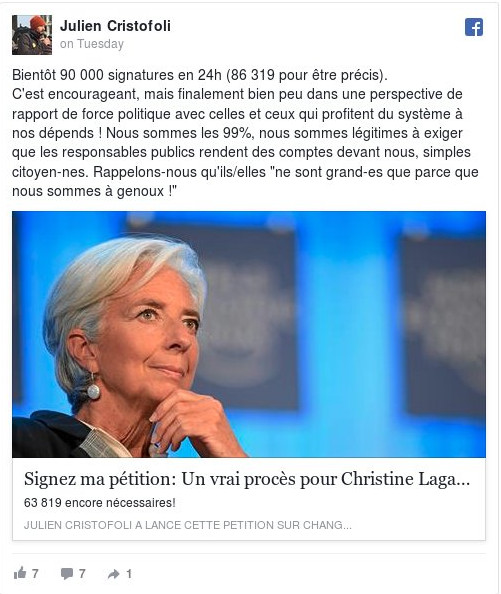 Το κείμενο που αναρτήθηκε στο σάιτ Change.org ζητάει μια «πραγματική δίκη» για την Λαγκάρντ κυκλοφόρησε αστραπιαία στα μέσα κοινωνικής δικτύωσης και συγκέντρωσε πάνω από 140.000 υπογραφές σε λιγότερο από τρεις ημέρες.