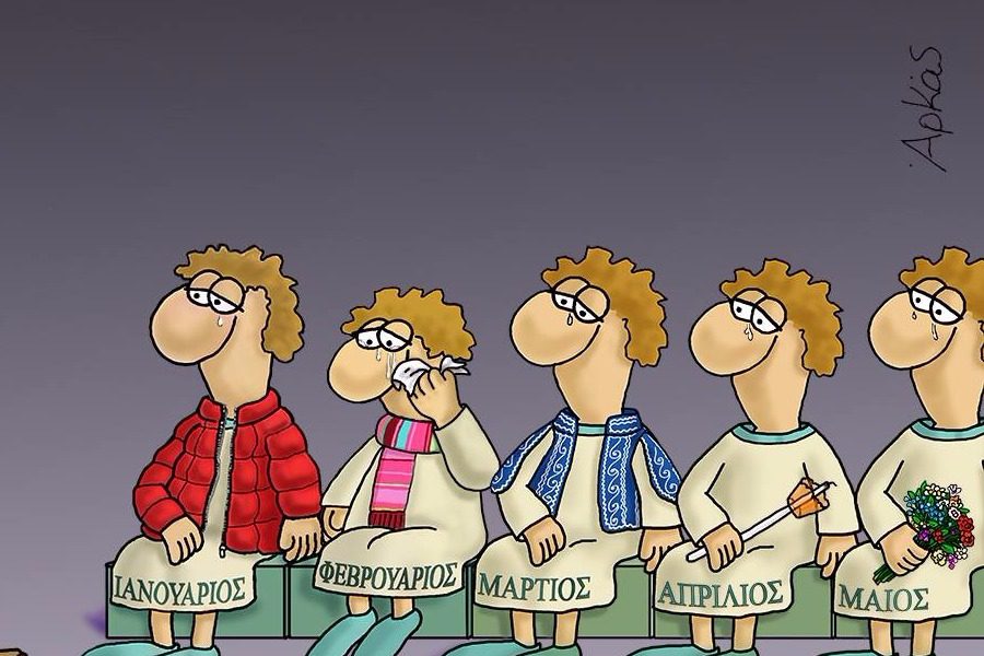 Ο «Φεβρουάριος και οι έντεκα μήνες» είναι ένα μικρό αριστούργημα του Αρκά, γιατί έχει όλα σχεδόν τα στοιχεία της Τέχνης του. Πρώτα πρώτα ο Αρκάς βλέπει κάτι που κανείς άλλος δεν βλέπει: τους δώδεκα μήνες και το μπαμπά τους το Χρόνο με σάρκα και οστά. Ντυμένοι με κάτι που μοιάζει με χλαμύδα, οι μήνες έχουν τον απολύτως δικό τους κόσμο: υπάρχουν, στρυμωγμένοι σε μια σειρά, αυτοί και άλλος κανείς. Το ίδιο το εύρημα είναι απίθανο, όμως η όποια κωμικότητα του θα εξαντλούνταν γρήγορα, αν ο Αρκάς δεν έκανε κάτι πανέξυπνο: έδωσε στον καθένα από τους μήνες προσωπικότητα, παίζοντας με κάποια στερεότυπα που τους ακολουθούν, αλλά και αυθαιρετώντας συγχρόνως, πιστώνοντάς τους, χάρη στη γλώσσα, με κουσούρια που δεν περιμένεις. Κυρίως ο τρόπος που ο ένας ειρωνεύεται τον άλλο είναι καταπληκτικός, όπως καταπληκτική είναι και η διάθεσή τους για καυγάδες. Η ουρά, στην οποία βρίσκονται όλοι και περιμένουν, δημιουργεί έτσι κι αλλιώς νευρικότητα.