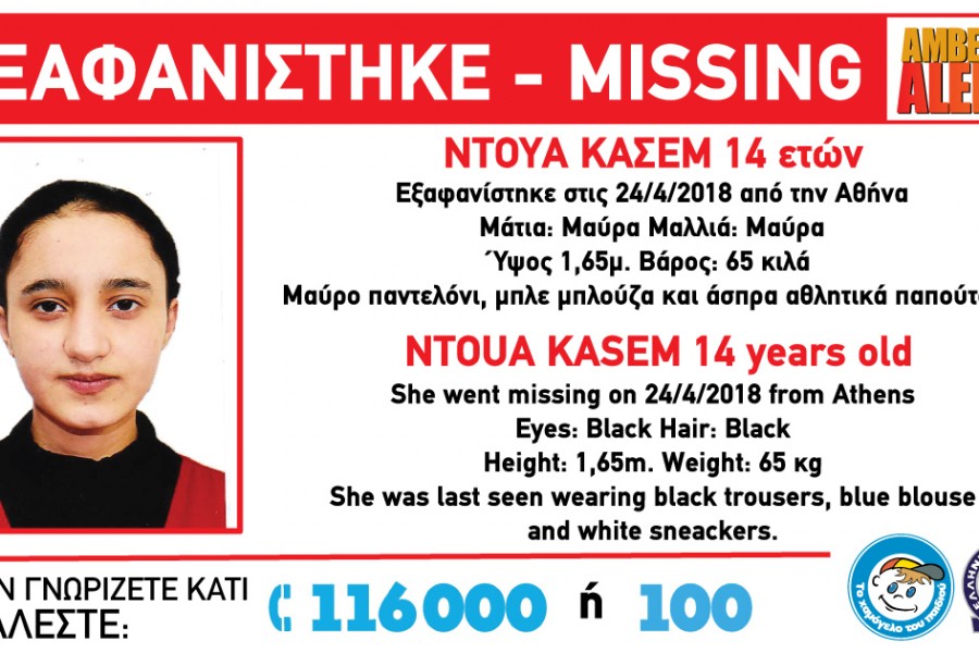 Βρέθηκε το βράδυ της Πέμπτης η 14χρονη Ντουά Κασέμ, η οποία είχε εξαφανιστεί στις...24/04/2018 από την περιοχή της Αθήνας.